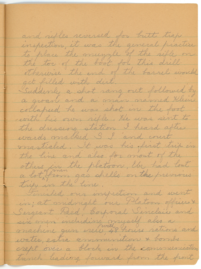Suddenly a shot rang out followed by a groan and a man named Klein collapsed he was shot in the foot with his own rifle. He was sent to the dressing station. I heard afterwards marked S I and court martialed. It was his first trip in the line and also for most of the others in the platoon. We had lost a lot of men from gas shells on the previous trip in the line.