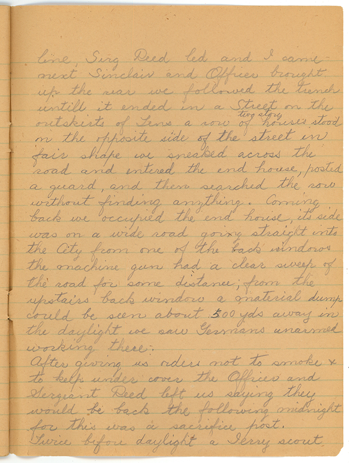 Finished our inspection and went in; at midnight our Platoon officer and Sergeant Reed, Corporal Sinclair and six men including myself also a machine gun crew with 48 hours rations and water, extra ammunition and bombs crept over a block in the communication trench leading forward from the front line, Serg. Reed led and I came next Sinclair and Officer brought up the rear we followed the trench untill it ended in a Street on the outskirts of Lens a row of two story houses stood on the opposite side of the street in fair shape we sneaked across the road and entered the end house, posted a guard, and then searched the row without finding anything.  Coming back we occupied the end house, its side was on a wide road going straight into the City from one of the back windows the machine gun had a clear sweep of the road for some distance; from the upstairs back window a material dump could be seen about 500 yds away in the daylight we saw Germans unarmed working there.