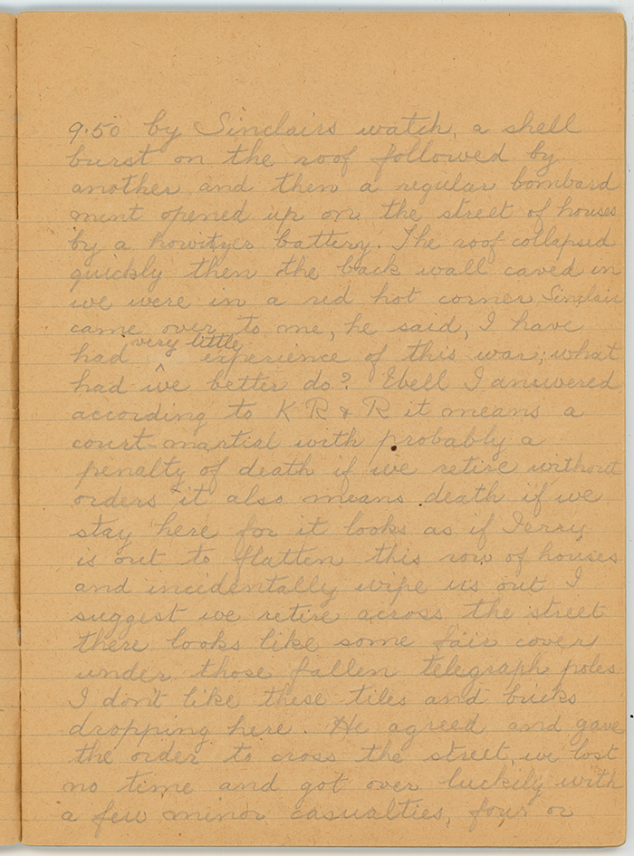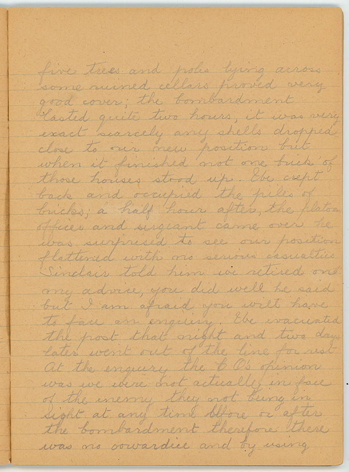 For 4 or 5 nights we held our post without discovery when one evening about 9pm an enemy patrol came down and halted on both sides of the road their leaders were not more than 30 paces away when they stopped and I counted 20 men, our fingers were on the triggers and a few paces more would have brought them to the mark at which we had agreed to open fire. Some time they stood there and the silence in that vicinity could be felt except for an occasional report from gun or shell in the distance. Had they suspected the houses were occupied they would hardly have stood upright within pistol range looking at them, and yet it was their territory and their job as scouts to see that the enemy was'nt in occupation. They did not have the nerve to come and see, instead turned about and filed into the darkness at 9:20pm; they had other ways: thirty minutes after 9:50 by Sinclairs watch, a shell burst on the roof followed by another and then a regular bombardment opened up on the street of houses by a howitzer battery. The roof collapsed quickly then the back wall caved in we were in a red hot corner.  Sinclair came over to me, he said, I have had very little experience of this war, what had we better do? Well I answered according to K R and R it means a court-martial with probably a penalty of death if we retire without orders it also means death if we stay here for it looks as if Jerry is out to flatten this row of houses and incidentally wipe us out I suggest we retire across the street there looks like some fair cover under those fallen telegraph poles I don't like these tiles and bricks dropping here. He agreed and gave the order to cross the street, we lost no time and got over luckily with a few minor casualties four or five trees and poles lying across some ruined cellars proved very good cover; the bombardment lasted quite two hours, it was very exact scarcely any shells dropped close to our new position but when it finished not one of those houses stood up, we crept back and occupied the piles of bricks; a half hour after, the platoon officer and sergeant came over he was surprised to see our position flattened with no serious casualties.  Sinclair told him we retired on my advice, you did well he said but I am afraid you will have to face an enquiry. We evacuated the post that night and two days later went out of the line for rest. At the enquiry the C.O.'s opinion was that we were not actually in face of the enemy they not being in sight at any time before or after the bombardment therefore there was no cowardice and by using good judgment the lives of the party had been saved.