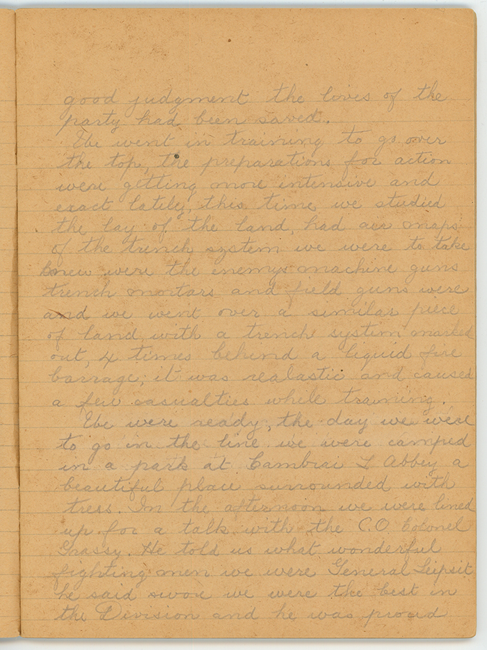 We were ready; the day we were to go in the line we were camped in a park at Cambrai L'Abbey a beautiful place surrounded with trees. In the afternoon we were lined up for a talk with the C.O. Colonel Grassy. He told us what wonderful fighting men we were. General Leipsit he said swore we were the best in the Division and he was proud to command us: we had never failed him he said or ever lost a trench and after throwing a few more boquets he wound up by saying he did not want any prisoners, one or two perhaps but no more. The Padre Mr. Pringle wished to say a few words after which the regiment would be dismissed but must not leave camp but stand by for orders.