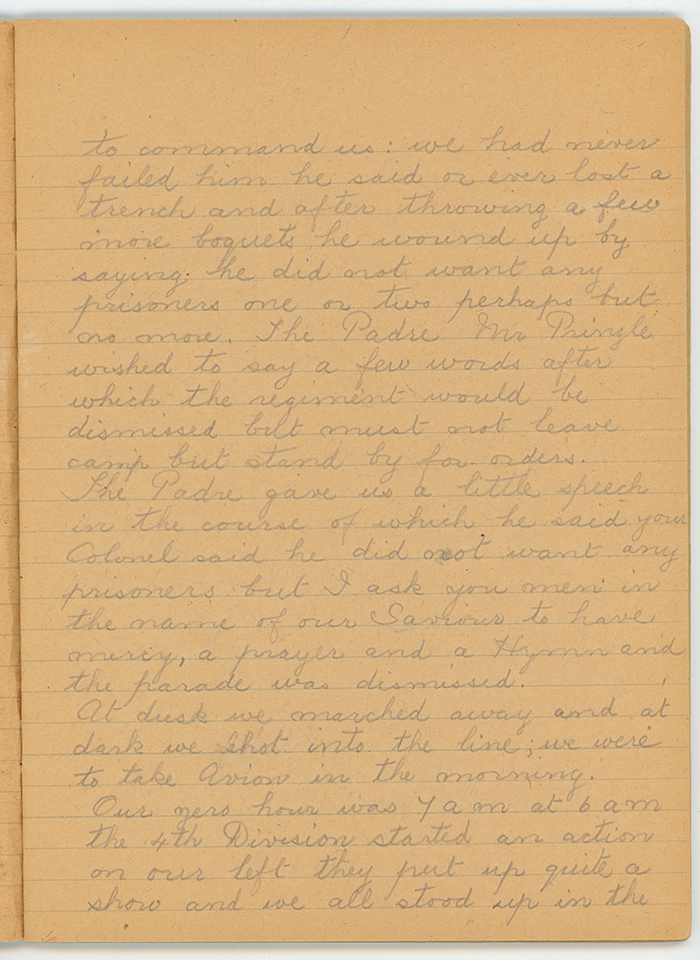 The Padre gave us a little speech in the course of which he said your Colonel said he did not want any prisoners but I ask you men in the name of our Saviour to have mercy, a prayer and a Hymn and the parade was dismissed.
