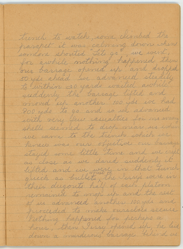 Our zero hour was 7am at 6am the 4th Division started an action on our left they put up quite a show and we all stood up in the trench to watch, some climbed the parapet it was calming down when someone shouted "Let's go", we went, for a while nothing happened then our barrage opened up and dropped 50 yards ahead  we advanced steadily to within 20 yards waited a while suddenly the barrage lifted and moved up another 100 yds we had 800 yds to go and so we advanced with very few casualties for no enemy shells seemed to drop near us when we came to the trench which we knew was our objective our barrage stayed some little time and we crept as close as we dared suddenly it lifted and we were in that trench quick as bullets most of the Jerrys were in their dugouts half of each platoon remained to mop up and the rest of us advanced another 100 yds and proceeded to make ourselves secure .