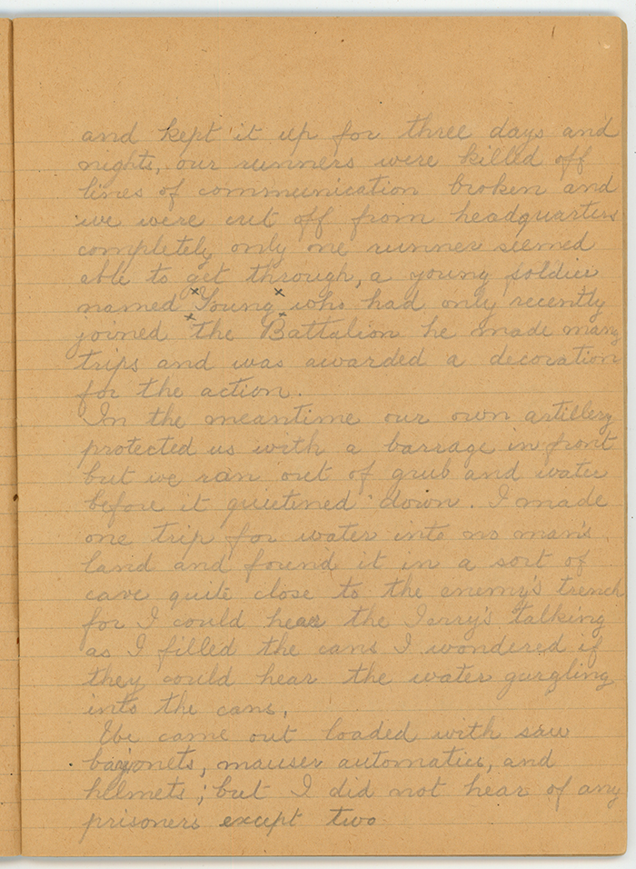 In the meantime our own artillery protected us with a barrage in front but we ran out of grub and water before it quietened down. I made one trip for water into no man's land and found it in a sort of cave quite close to the enemy's trench for I could hear the Jerry's talking as I filled the cans. I wondered if they would hear the water gurgling into the cans.