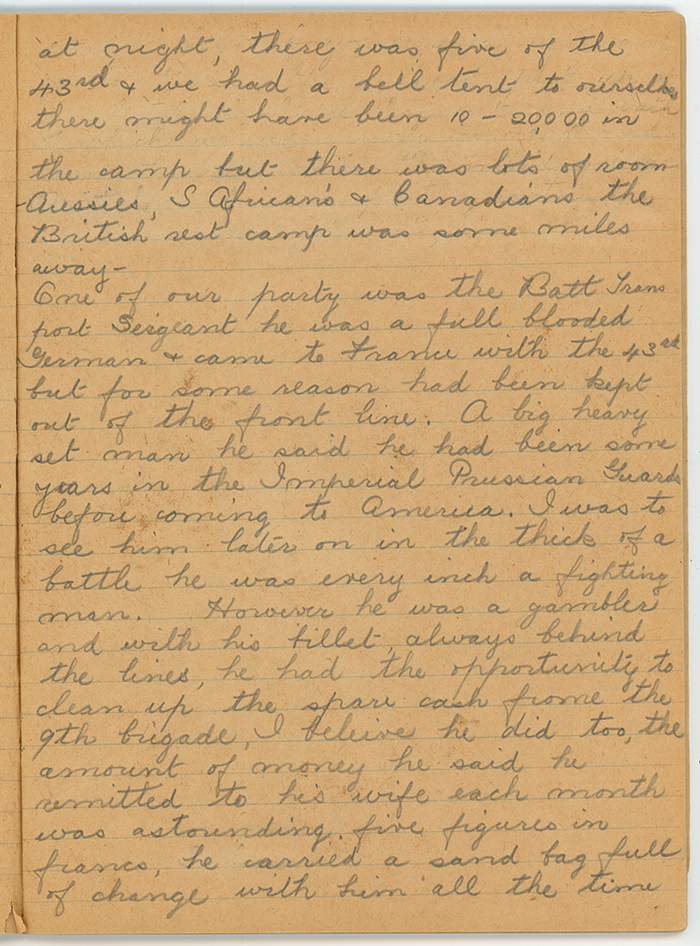 One of our party was the Batt Transport Sergeant he was a full-blooded German and came to France with the 43rd but for some reason had been kept out of the front line. A big heavyset man he said he had been some years in the Imperial Prussian Guards before coming to America. I was to see him later on in the thick of a battle he was every inch a fighting man. However, he was a gambler and with his billet always behind the lines, he had the opportunity to clean up the spare cash from the 9th brigade, I believe he did too, the amount of money he said he remitted to his wife each month was astounding, five figures in francs, he carried a sandbag full of change with him all the time.