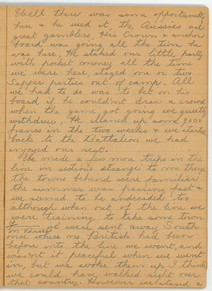 Well, there was some opportunity here and he used it, the Aussies are great gamblers. His Crown and anchor board was going all the time he was here. He staked our little party with pocket money all the time we were here, staged one or two Supper parties out of camp. All we had to do was to bet on his board if he could'nt draw a crowd when the game got going we quietly withdrew. He cleaned up some 9000 francs in the two weeks and we started back to the Battalion we had enjoyed our rest.