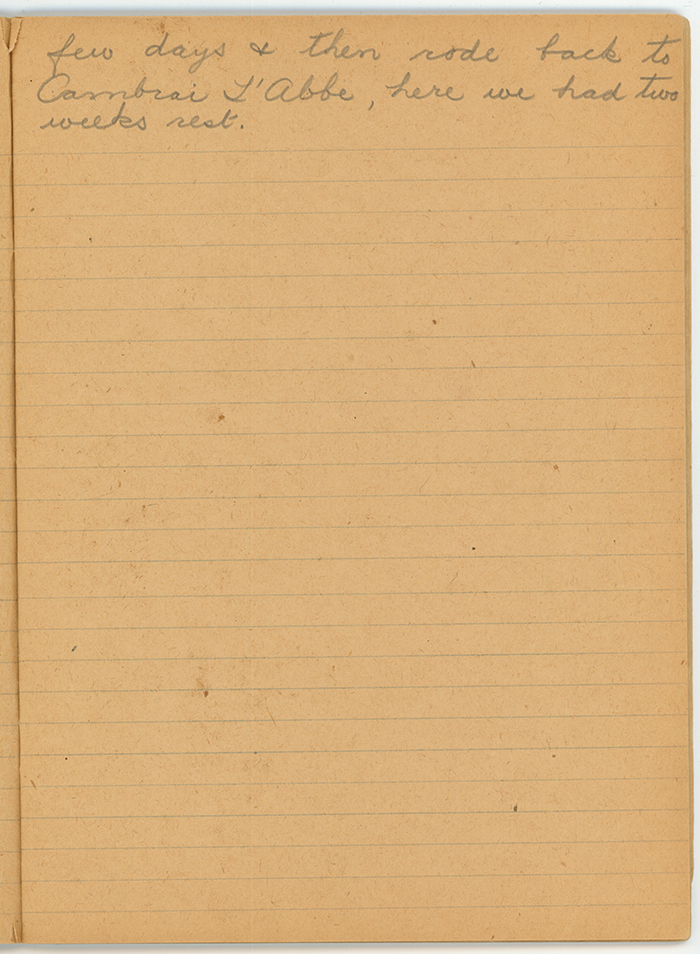 We made a few more trips in the line in sections strange to me though the towns behind were familiar the summer was passing fast and we seemed to be undecided too although when out of the line we were training to take some town – we were sent away South once on Busses where no British had been before into the line we went, and was’nt it peaceful when we went in, but we woke them up I think we could have walked right over that country.  However we stayed a few days and then rode back to Cambrai L’Abbe, here we had two weeks rest.