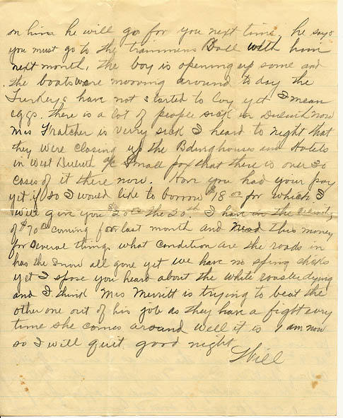 [?] Mother had to leave this and go over to B's as Mr. B. is worse, I was over there this evening and he is verry sick I took the cow down this afternoon shipped her off the frieght was $4.20 I paid it and got receipt for same I should have gone out to night at 9:30 but missed the run as I am out of the calling district. I saw Mr. Johnson this afternoon and he was making all kinds of appoligies for going out for you he sows if you are not mad on him he will go for you next time he says you must go to the trainmens Ball with him next month, the boy is opening up some and the boats were moving around to day the Turkeys have not started to cry yet I mean eggs there is a lot of people sick in Duleuth now Mrs Fratcher is verry sick I heard to night that they were closing up the bding houses and Hotels in West Duleuth [?] small pox that there is over 30 cases of it there now. Have you had your pay yet if so I would like to borrow $18.00 for wich I will give you $20.00 the 20th. I have in the vincity of $70.00 coming for last month and need this money for several thing what condition are the roads in has the snow all gone yet we have no spring chicks yet I spose you heard about the white roaster dying and I think Mrs Merritt is trying to beat the other one out of his job as they have a fight every time she comes around will it is 1 am now so I will quit good night